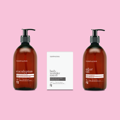 Das RainPharma Duschritual verwandelt jede Dusche in ein wohltuendes Erlebnis. Geben Sie einen Pumpstoß Skin Wash auf das Body Wonder Towel, um die Haut sanft zu reinigen – mit genau der richtigen Menge Schaum – und den Körper gleichzeitig zu peelen. Tragen Sie anschließend After Oil auf die nasse Haut auf, spülen Sie es ab und voilà: Beim Verlassen der Dusche ist Ihre Haut sauber, seidig weich und wunderbar duftend.