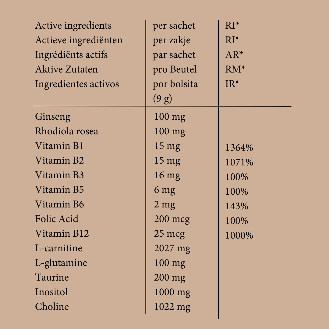 Experience the unique composition of Mood, containing Ginseng, Rhodiola Rosea, Carnitine, glutamine, taurine, inositol, choline and B-vitamins. energy and psychological function Vitamin B1, B3, B6 and B12 contribute to normal energy-yielding metabolism, to normal functioning of the nervous system and to normal psychological function.Vitamin B2, B3, B5, B6, B9 and B12 also help to reduce fatigue. l-carnitine The ingredients list mentions acetyl-L-carnitine. RainPharma has deliberately chosen this easily absorbable form because it is considered to be very active. adaptogens Adaptogens are substances that can modulate processes in the body, such as sensitivity to external factors. For example, they can optimise the organism's resistance to stress. The Latin ‘adaptare’ means ‘to adapt’ and that is exactly what adaptogens support you in. metabolism Vitamin B5 contributes to a normal metabolism of some neurotransmitters.Vitamin B6 contributes to normal protein and glycogen metabolism.Choline contributes to normal lipid metabolism and to the maintenance of normal liver function. perfect match Where Mood is your on-button to start the day right, Yoga is your off-button to end the day ideally.