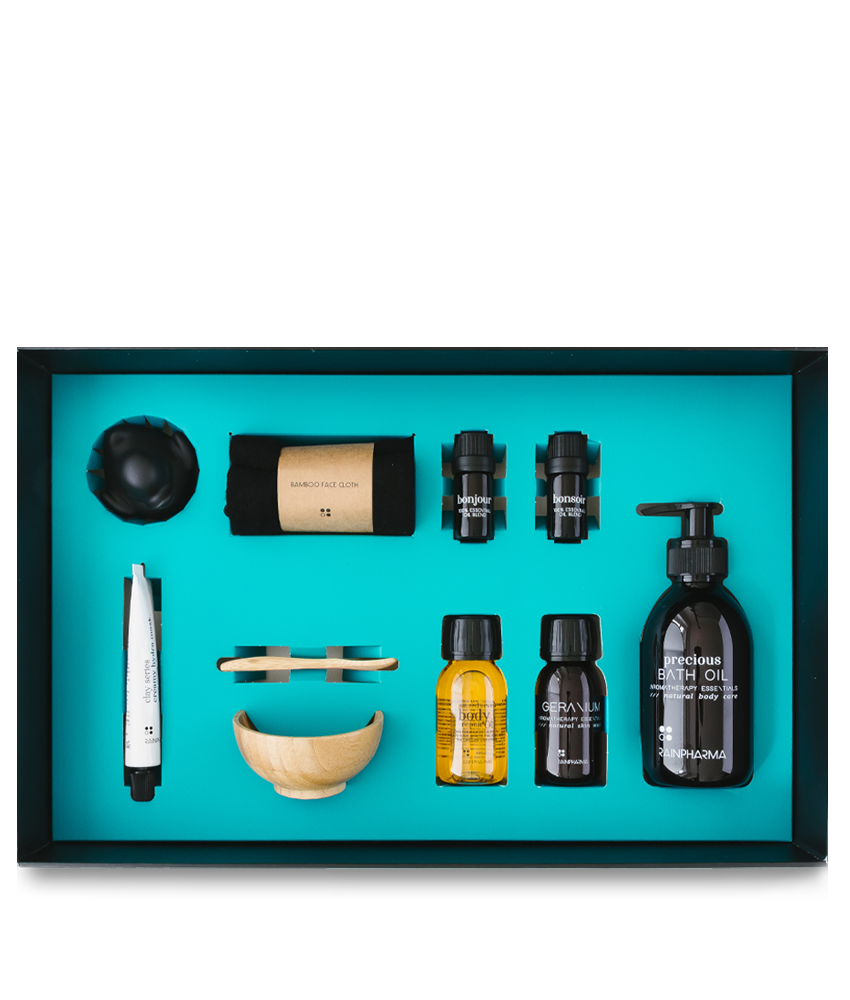 1) Squirt 20 pumps of Precious Bath Oil in the little bamboo bowl and mix it with a few drops of essential oil. Go for a boost with Bonjour Blend or immerse yourself in the relaxing Bonsoir Blend. Essential oil should not come into direct contact with the skin. This is why you need to mix everything well with the bamboo spoon before you pour the bath oil into the warm bath. Do you have sensitive skin or are you putting your kids in the bath? Then it’s best not to add any essential oils.