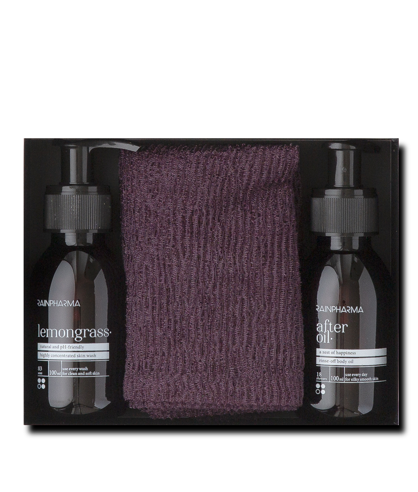 In this premium shower set you’ll find our absolute bestseller and the first fragrance in your collection: Lemongrass. By using the Body Wonder Towel, you can transform the Skin Wash into a cloud of natural foam, while gently scrubbing your skin. Finish off each shower with our other bestseller, Classic After Oil.