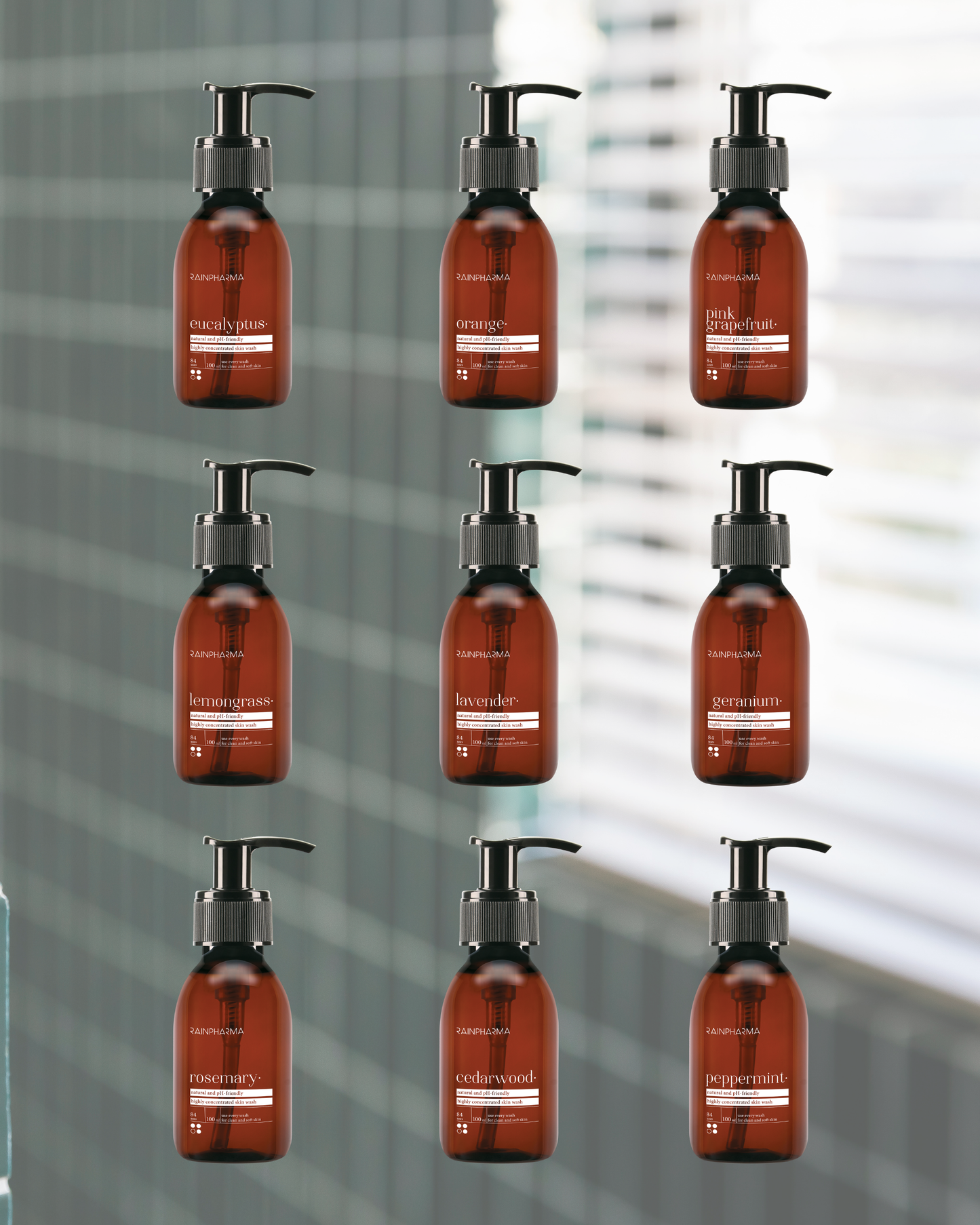 In deze handige voordeelset vind je onze 9 populairste Skin Washes in klein formaat. Van citroengras en eucalyptus tot lavendel en rozemarijn. Verspreid de flesjes over je huis of zet ze alle 9 in je douche en laat je geurkeuze bepalen door je stemming of het moment van de dag. Eén ding is zeker: met een natuurlijke RainPharma Skin Wash zit je sowieso goed.